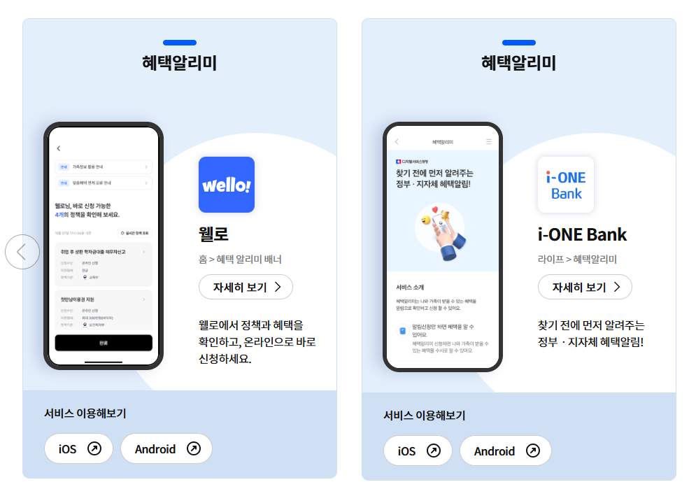 - 복지알리미 → 푸시 알림 중심의 일상 복지 (생계급여, 주거급여, 돌봄 서비스 등) 확인을 원하는 경우